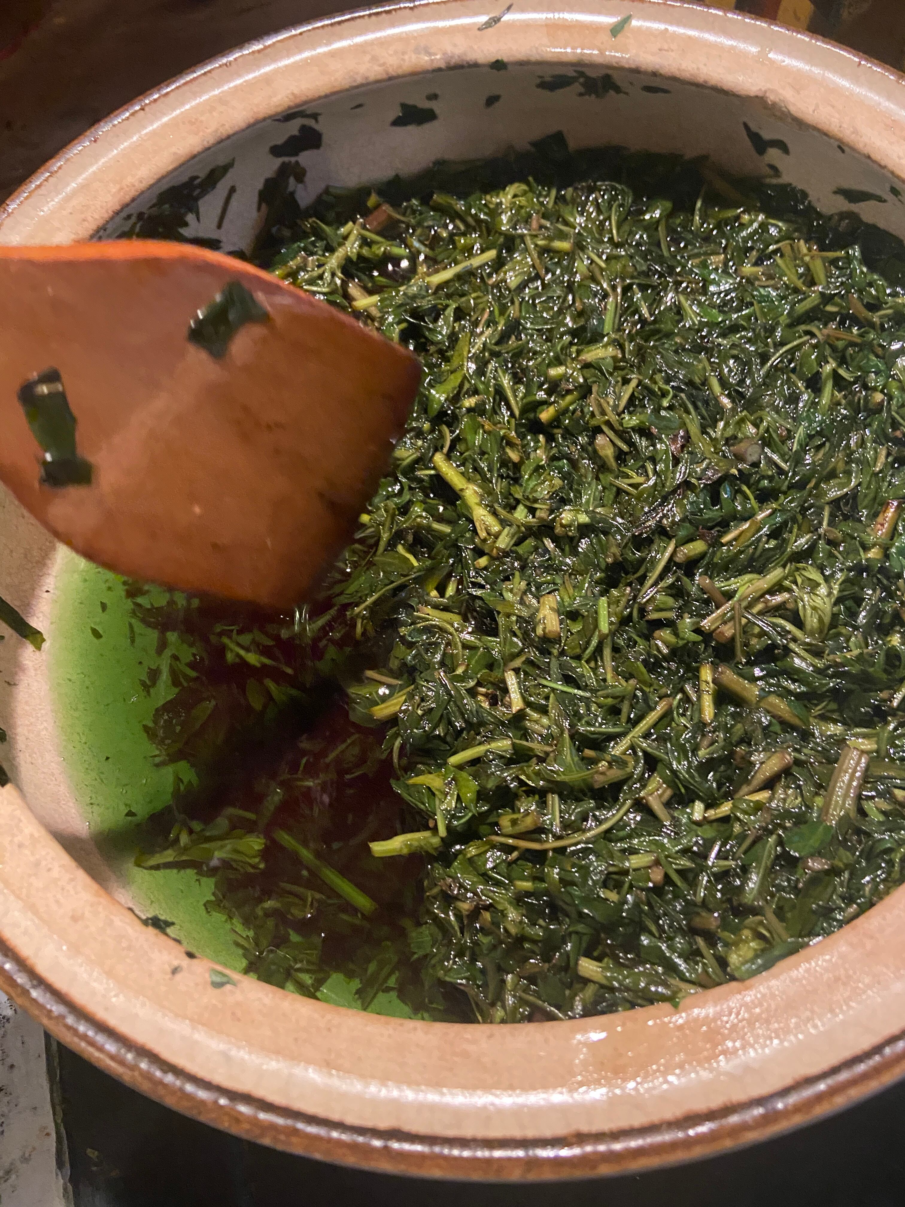 太白ごま油を土鍋に入れ、70℃以内でゆっくり30分〜1時間、くるくるします。