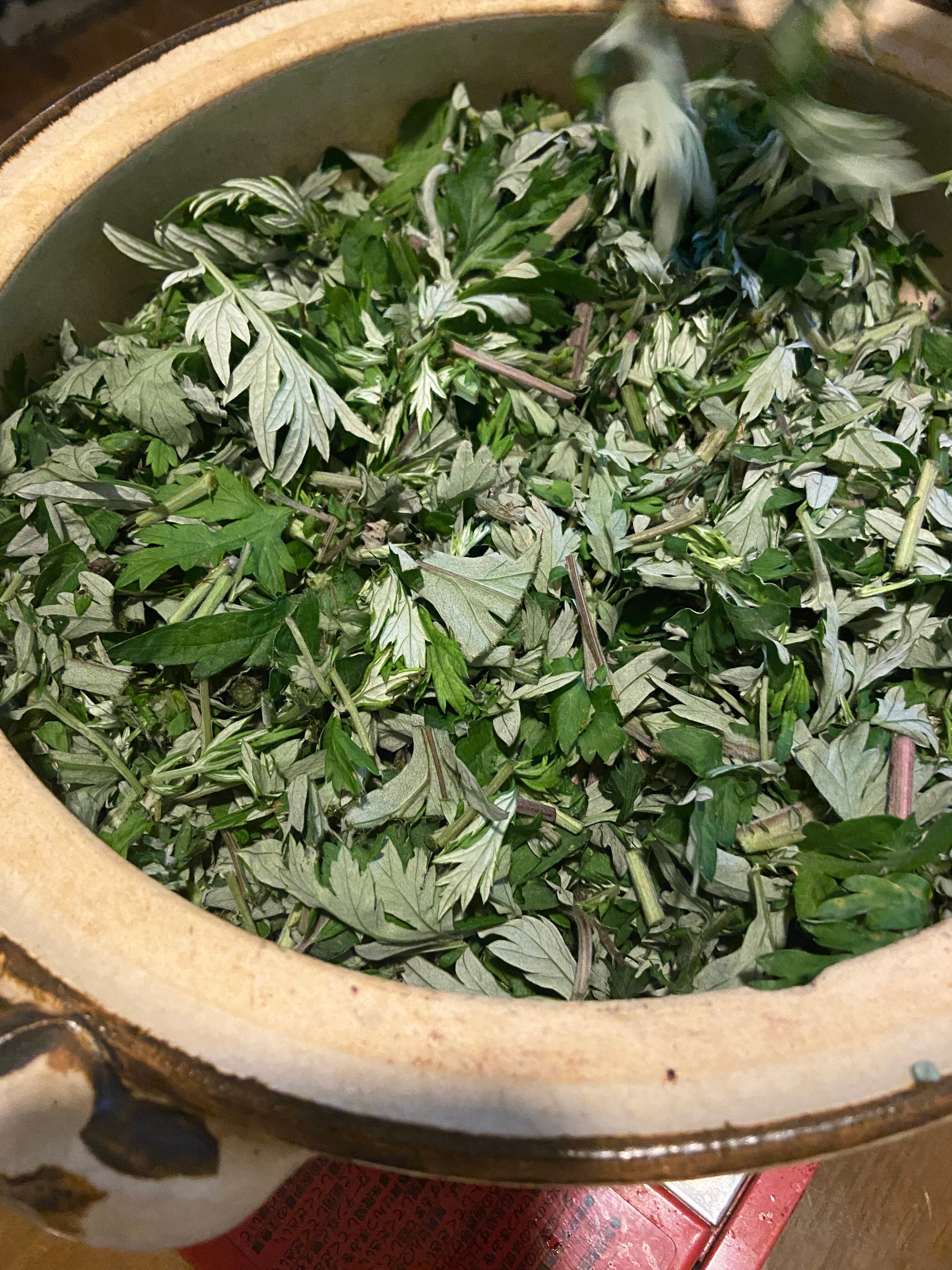 油に真菰のエキスがうつったら、熱いうちにサラシなどで絞り、容器に入れてできあがりです。